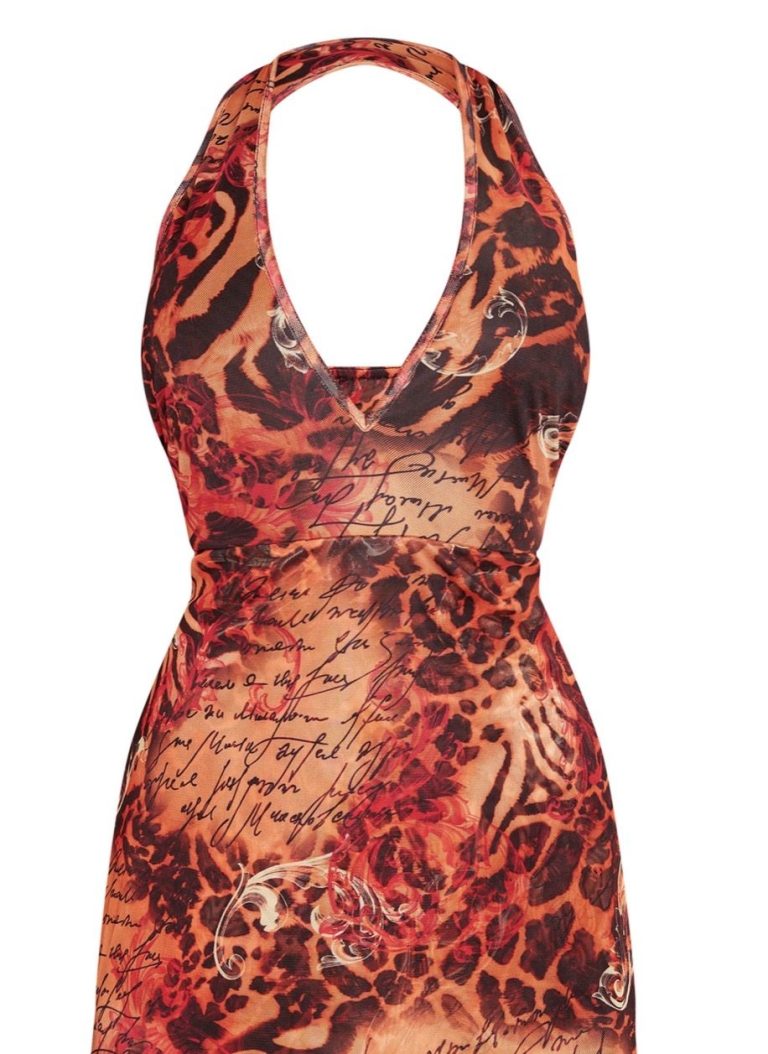 Orange & brown Leopard Dress w/out the words, wrap around your neck short dress.